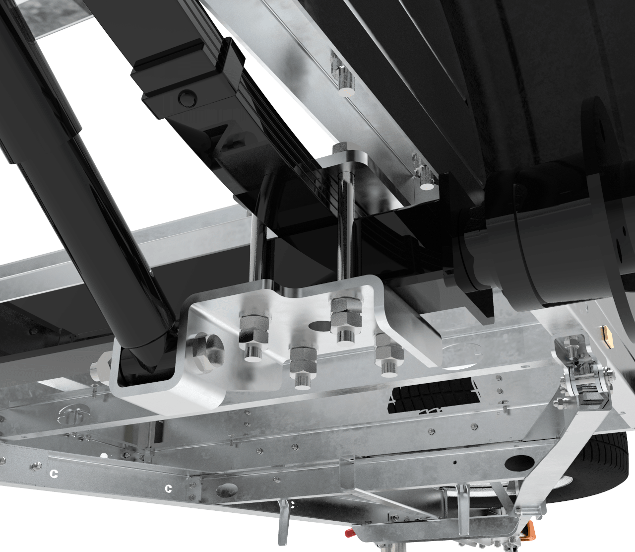 - две четырехлистовые специализированные рессоры со скользящим концом. Одна рессора рассчитана на нагрузку 375 кг. Одно из основных преимуществ – высокая степень затухания колебаний, т.е. рессора выполняет функцию и амортизатора, что обеспечивает лучшее соприкосновение колес с неровной дорогой. Конструкция рессоры со свободным концом позволяет избежать деформации самой рессоры и кронштейнов крепления при больших динамических нагрузках.